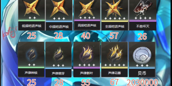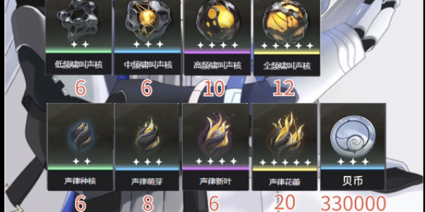 全频呓语声核x4,紫珊瑚x20,隐雷声核x16,贝币x80000