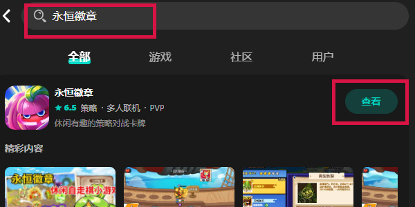 2.选择自己对应的系统下载,在下载安装成功以后点击进入TapTap,在最上方的搜索栏进行搜素永恒徽章,随后点击右侧的查看,进入页面。