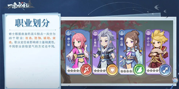 修士根据自身的战斗特点一共分为四个职业:攻击、防御、辅助、突击。