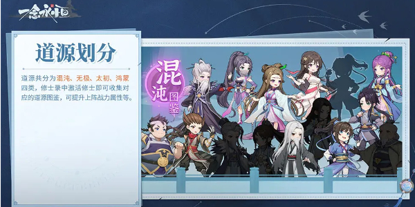 在游戏中按照道源共分为混沌、无极、太初、鸿蒙四类,玩家可以在修士录中激活修士即可收集对应的道源图鉴,可提升上阵战力属性等。
