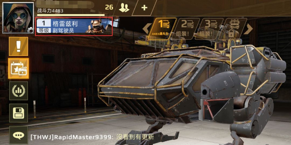 在游戏中车库的主界面,可以看到在界面左上角的个人资料,在个人资料的下方有一个横幅,横幅上标有战车上的副驾驶员,会显示他的稀有度和等级。