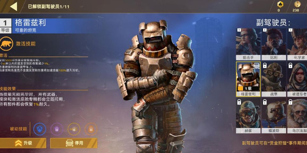 点击这个横幅就可以进入副驾驶界面,在副驾驶界面左侧会显示所选取副驾驶的相应技能效果,右侧则列出了游戏中目前所有可用的副驾驶人物列表。