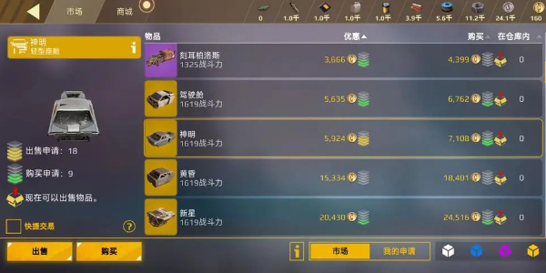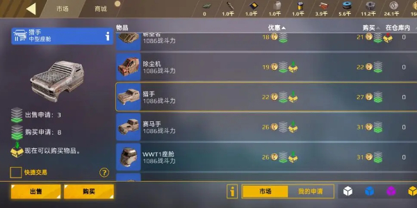 玩家进入游戏车库主界面,点击下方的“市场”图标就可以进入二级市场了。工程师可以通过这一功能参与游戏内的市场交易,通过赚取或花费金币,在市场中交易包括资源在内的各项道具。