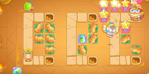 8.在清理完成以后,在右侧指定位置放置第四个果汁瓶并升级,清理周围的障碍物。