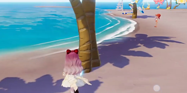 2、来到下图所在的沙滩区域,在椰子树下找到发光的球(李臻的备用琴弦),然后返回将其交给李臻就可以完成任务。