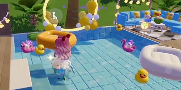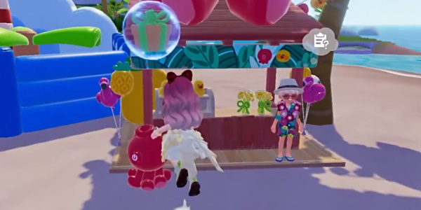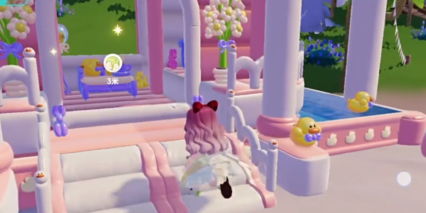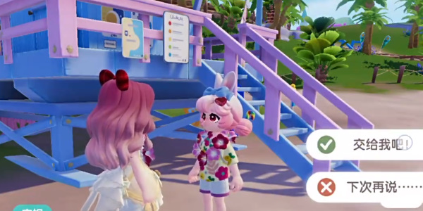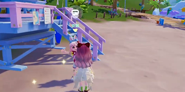2、对话结束后我们找到波叔对话,然后来到波叔身后的泳池站一下,接着来到右侧的充气城堡;最后返回与波叔再次对话就可以完成任务。