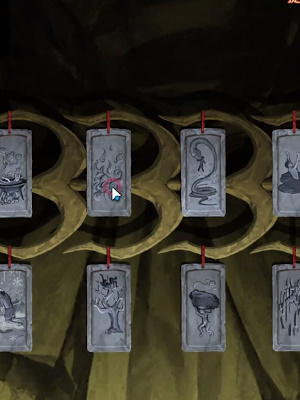 1、根据孟婆咖啡馆门上的的图案线索,来到寺庙门口将雕像上的吊牌按照对应的位置摆放即可,对应的的分别是蛇对着锅、火对着树、云对应山、刀对应雪花,完成解谜后获得粗香和剪刀。