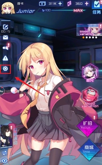 2、在学院功能界面找到设置图标,就是在角色的左边的齿轮按钮。