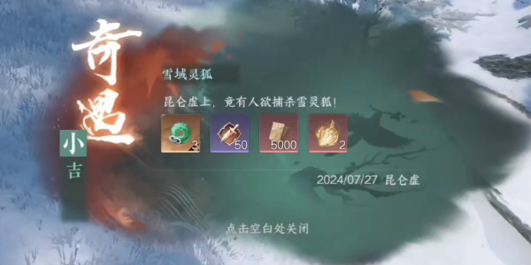 1.前往坐标昆仑墟【1044,1401】,靠近【雪灵狐】触发小吉奇遇【雪域灵狐】,如果没有看到【雪灵狐】,可前往右上角进行切换线路或者切换地图刷新。
