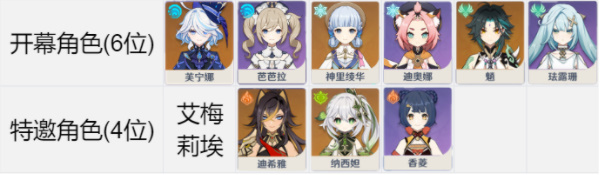 开幕角色(6位):芙宁娜、芭芭拉、神里绫华、迪奥娜、魈、珐露珊。
