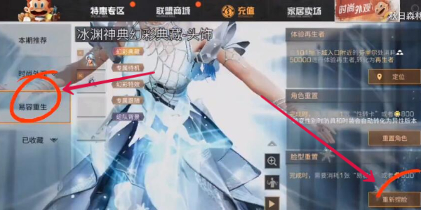 2、在时尚外观界面,我们先点击左侧菜单栏中的易容重生,然后点击右侧的重新捏脸。