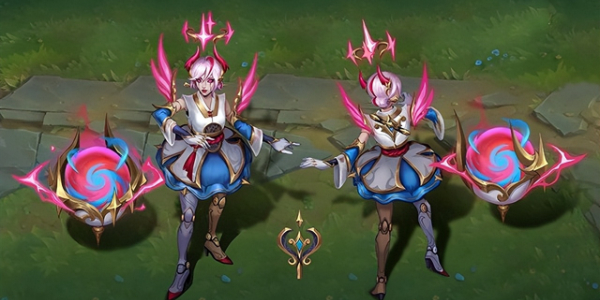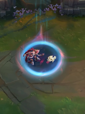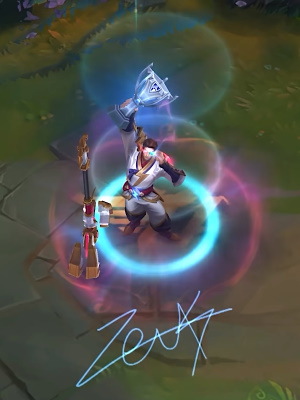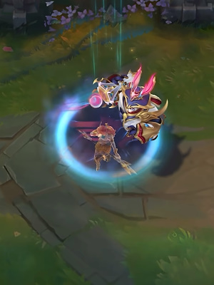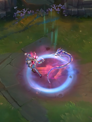 粉蓝色的球配着蓝色的裙子,整个英雄透露着诡异的氛围。根据设计师透露是Faker希望这款皮肤能够表达出类似AI机器人的效果。回城动作则是发条和一条龙玩耍,然后一起回城。