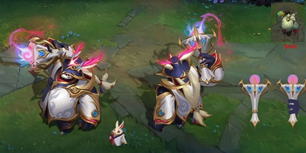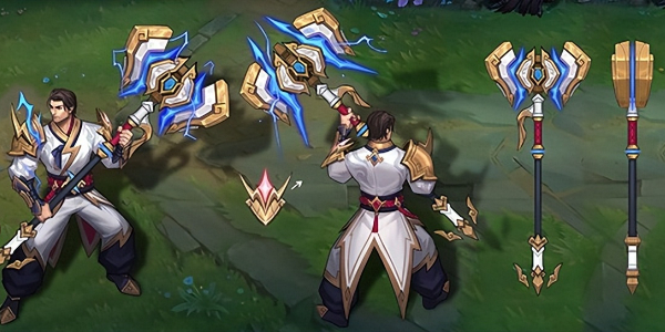 这款皮肤的亮点就是手上拿着奖杯,回城动作这边Keria也是费了心思,融入了他心心念念的拉克丝,巴德回城时先是在幻影中看到了拉克丝,拍了拍哭泣的拉克丝后,和拉克丝击掌成功回城。