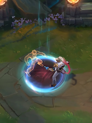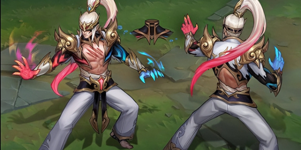 盲僧的这款冠军皮肤颜色比较鲜艳,两条手臂一条粉色一条蓝色,辫子也是淡粉色,造型很特别;回城动作则是出现一个盲僧的影子分身,在分身一番互动后,成功回城。