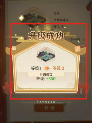 2、点击兰亭建筑后进入建筑升级界面,在升级界面中玩家需要准备好对应的升级材料,当一切准备完成后就可以点击下方【升级】按钮。