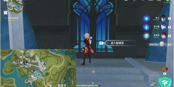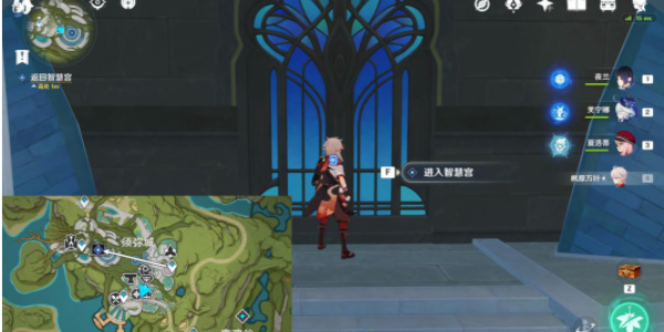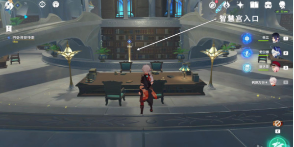 3.接着文明前往教令院内部的智慧宫,然后在智慧宫电梯背面的书架旁与派蒙对话。