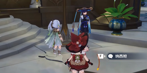 玩家打开地图传送到须弥城,然后进入大巴扎,在大巴扎的舞台中央可以找到妮露带着帕蒂沙兰、杏仁长老、溪泉了解这个世界。