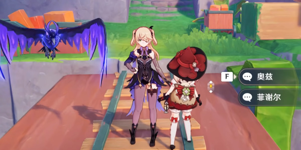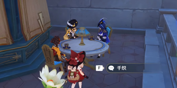 玩家传送到枫丹廷右侧的传送锚点,然后来到千织屋附近,可以找到正坐在一起对话的娜维娅、千织、克洛琳德,娜维娅正在邀请千织和克洛琳德前往希穆兰卡的王城中。
