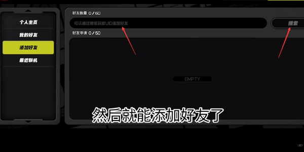 4.在添加好友界面,我们在搜索框中输入好友的游戏uid,然后点击后方的搜索按钮就可以找到对应的好友天击即可。