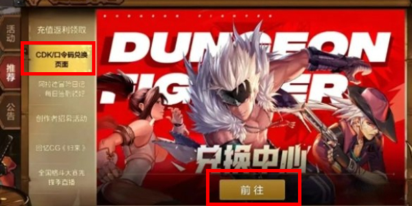 1.进入游戏界面,在游戏的活动中心处点击CDK/口令码兑换页面,点击【前往】。