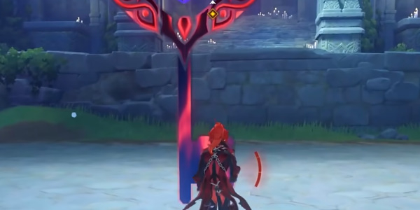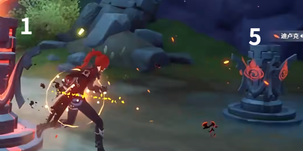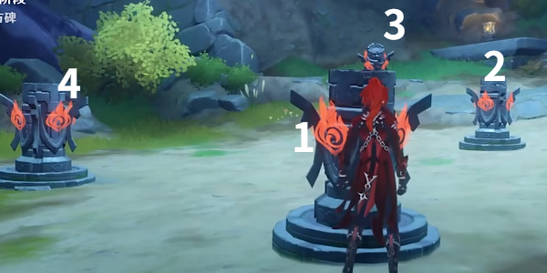 2.进入挑战以后前往指定地点,如图所示,使用大招将前方的火元素方碑全部点燃,随后立马转到身后镜头使用普攻或者小技能点燃最后一个方碑,大门即可开启。
