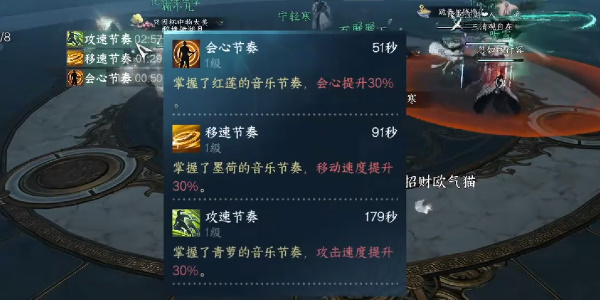 3.在boss【青萝】出场的时候一直按【闪避】按键,将图中所示的buff栏叠到十层变为【攻速节奏】,三种buff栏同时存在即可完成。