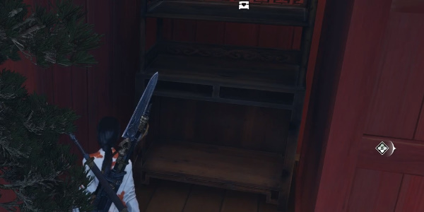 9.我们跟随任务上楼,在楼梯间左转时间可以看见横梁上有一个书生,我们跳过去可以在书生后面发现一个货架,货架上有物品,使用奇术将其拿到。