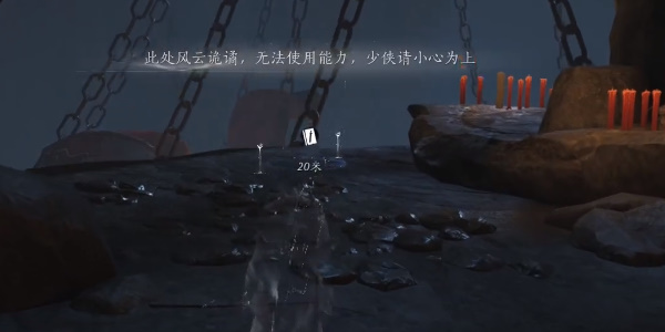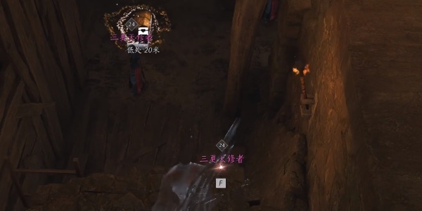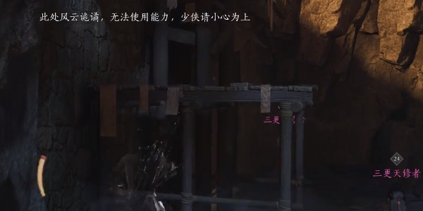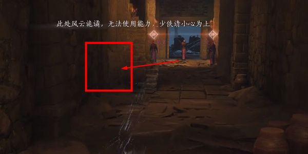 2.在山洞底部道路被三个npc拦住了,我们可以选择从左侧墙壁上的狗洞绕过去。(任务中玩家全程使用奇术踏无形将自己的身影隐藏起来)