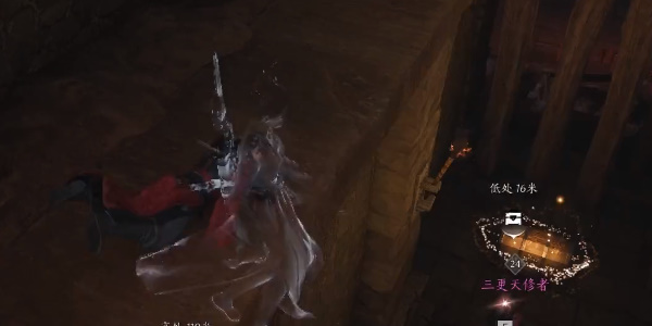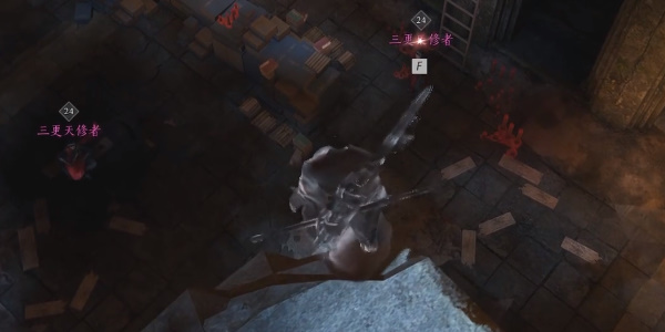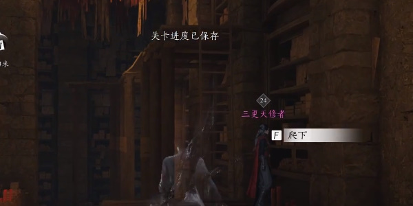 3.接着我们沿着楼梯一直往上走,直到遇见npc,我们使用听风辨位技能观察他的身位,然后跟在他身后,找准机会从木架上翻进房间。