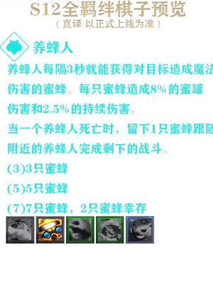 养蜂人每隔3秒就能获得对目标造成魔法伤害的蜜蜂,每只蜜蜂造成8%的蜜罐伤害和2.5%的持续伤害。当一个养蜂人死亡时,留下1只蜜蜂跟随附近的养蜂人完成剩下的战斗。