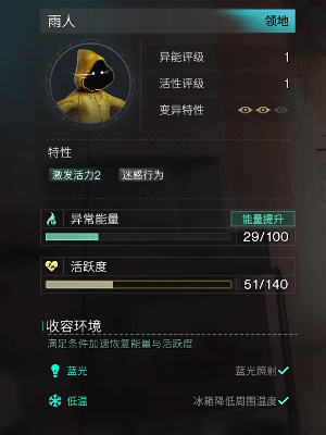 收容成功后,异常能量大于30自动激活进入工作状态,可为作物提供适合的灌溉水量,为其提升健康值,并且异能评级越高,健康度越高。