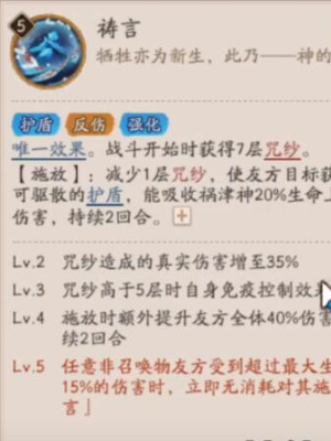 施放技能时减少1层 咒纱 ,使友方目标获得不可驱散的【护盾】,能吸收祸津神20%生命上限的伤害,持续2回合。