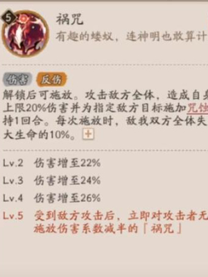 攻击敌方全体,造成自身生命上限20%伤害并为指定敌方目标施加【咒蚀】 ,维持1回合。每次施放时,敌我双方全体失去最大生命的10%。(祸津神造成的生命降低效果不超过自身初始攻击的900%)