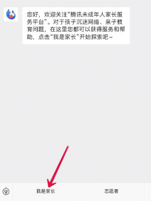 1.玩家首先打开微信,搜索公众号“腾讯未成年家长服务平台”,融合在公众号界面点击左下角的“我是家长”选项。