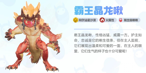霸王晶龙,性格凶猛,威震一方。护主如命,忠诚是它的啾生信条,但在主人面前,它们展现出温柔和可爱的一面,在主人的眼里,它们生气的样子也十分可爱呢!