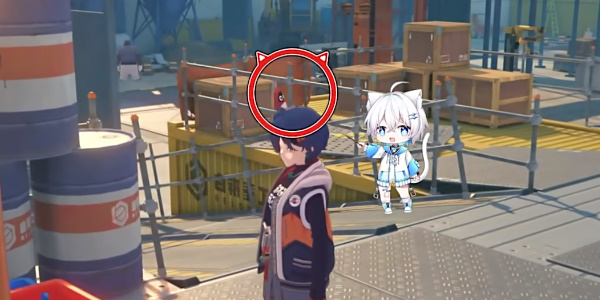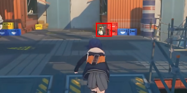 玩家在上午时间传送到仓储区,然后往左侧移动可以发现前方箱子上面有一个黑色的邦布。