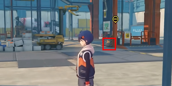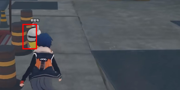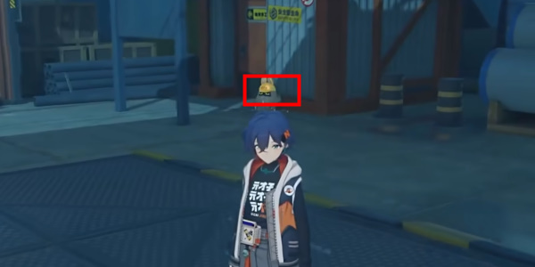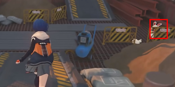 从旁边的斜坡下来后,视角右转,可以在不远处的一个牌子下发现一个戴着安全帽的邦布。