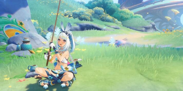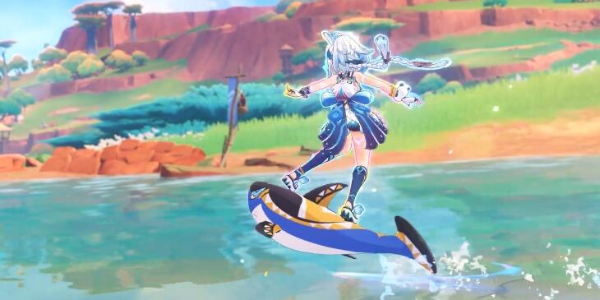 水元素的少女角色可以在动画中看出她十分喜欢钓鱼,还可以在水面上使用想鲨鱼一样的滑板进行滑行,特效十分好看。