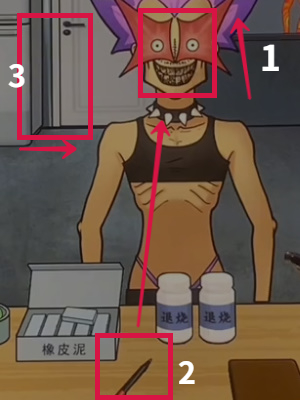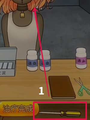 1.迎接第一位病人,将其【眼罩】往上拖动摘除,拿起桌上的【笔】给他画上眼睛,右滑【洗漱间】的门,拿出【牙刷】给他刷牙,拿出卓上的【橡皮泥】给他捏个鼻子,随后点击【治疗完成】。