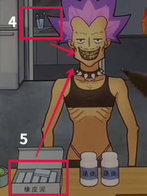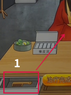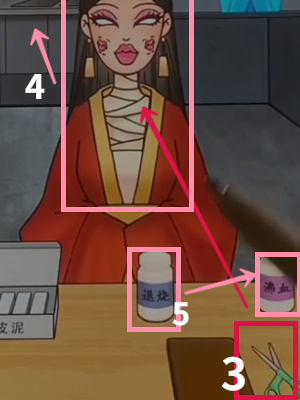 4.第四位病人,下滑左侧【抽屉】拿出【梳子】帮病人梳理头发,打开【冰箱】下层,拿出【盐水】放到病人头上,将桌上的【剪刀】放在病人【绷带】缠绕的位置,最后拖动病人放到门后的【洗漱间】,把桌上的【退烧药】拖动到【沸血丸】一起合成【活血丸】递给病人,点击【治疗完成】即可通关普通结局。