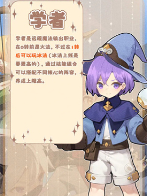 学者是游戏中的远程魔法输出角色,不推荐前期培养,强度偏低,在推图和boss战表现都不是很好,但可以等后期装备成型以后,元素转职为冰系能够大幅度提升伤害,技能命中敌人造成减速以及控制效果。