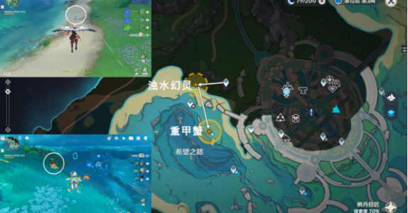 2、对话结束后传送到枫丹廷区西方向锚点,往地图的西方向飞;前往海滩边,击败浊水幻灵获得材料;前往海里获得异色重甲蟹能力,击败原海异种获得材料。