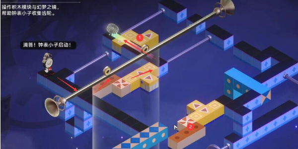 4、第四个齿轮路线如下图所示,玩家将模块1旋转三次,然后将模块2向左移动,最后调整幻梦之镜就可以拿到第四个齿轮。