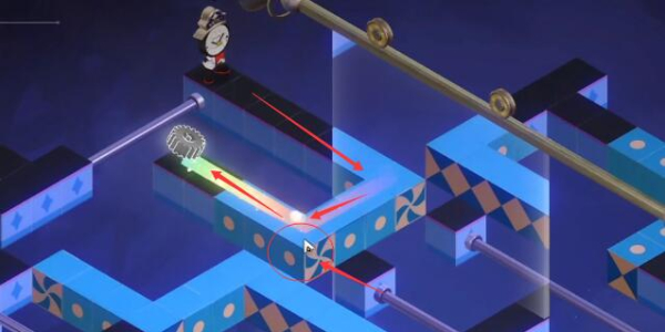2、进入解密,玩家通过旋转蓝色的积木模块组装成下图所示的路线,使钟表小子拿到第一个齿轮。