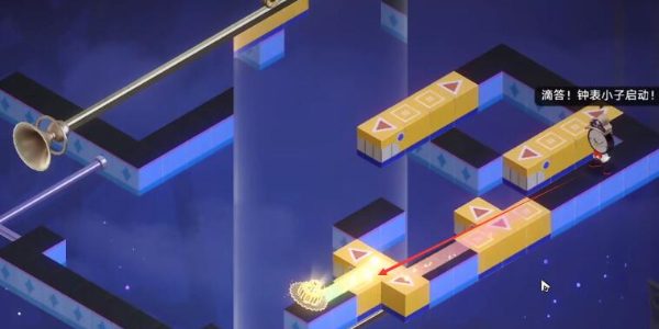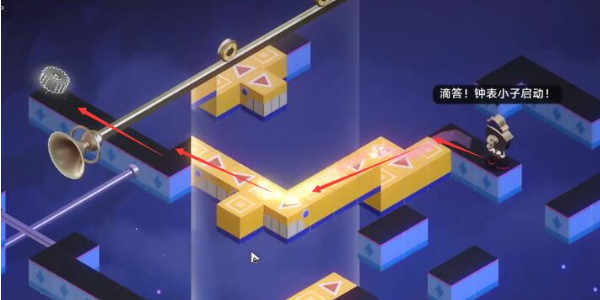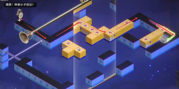 2、第一个赤露需要玩家移动三处黄色的积木形成移动路线,使钟表小子拿到第一个齿轮,路线如下图所示。