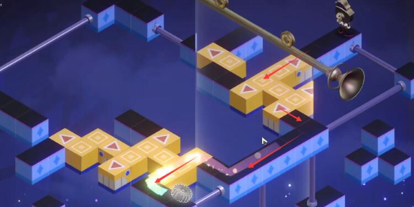 4、接着我们继续移动两处黄色的积木模块,然后将幻梦之镜向右侧移动一点,达成如下图所示的路线就可以拿到第三个齿轮。