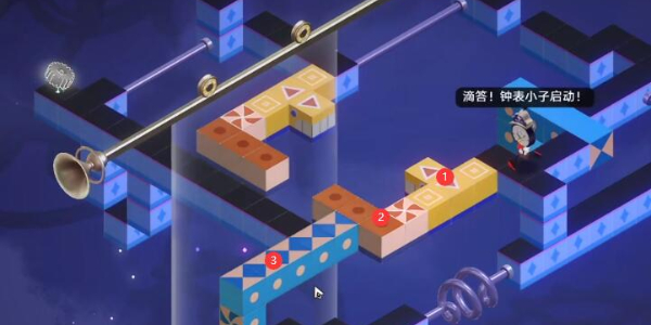 5、接着将模块1向左移动一格,模块2旋转1次,模块3旋转3次就可以使钟表小子拿到第二个齿轮。