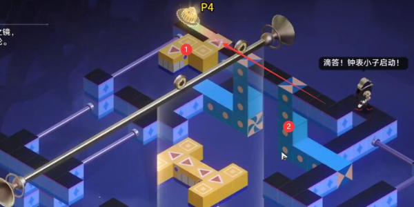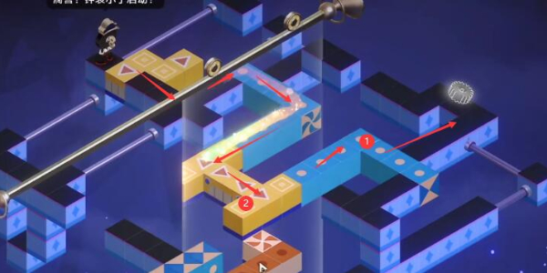 7、第四个齿轮路线如下图所示,玩家将模块1旋转三次,然后将模块2向左移动,最后调整幻梦之镜就可以拿到第四个齿轮。