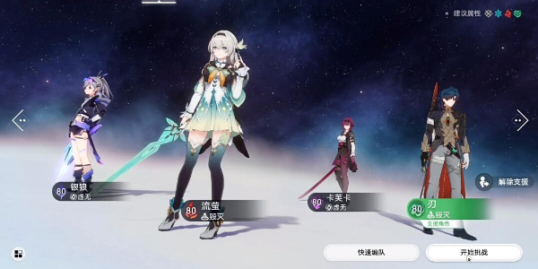 1、玩家在游戏中随便找到一处侵蚀隧道或敌人进行挑战,在进入编队界面时,必须要带上包含银狼、刃、卡芙卡、流萤进行组队(如果缺少其中一个角色可以使用他人的支援角色进行编队。)。
