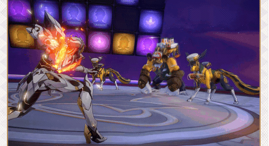 跳跃至空中并进行自由移动,持续若干秒,此时施放下落攻击可以提前结束持续时间。持续时间结束后,下落并立即攻击一定范围内的所有敌人,每个波次开始时为敌方全体添加火属性弱点,持续若干回合,此后对敌方全体造成火属性伤害。
